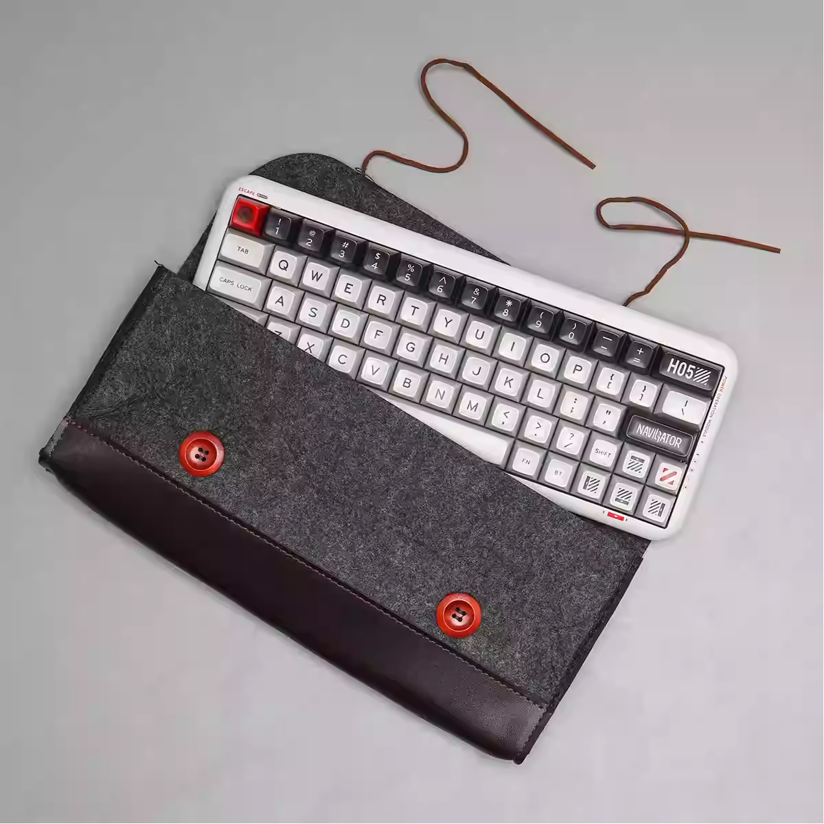 Qube mechanical keyboard storage with rope wrapping and felt leather protective bag.