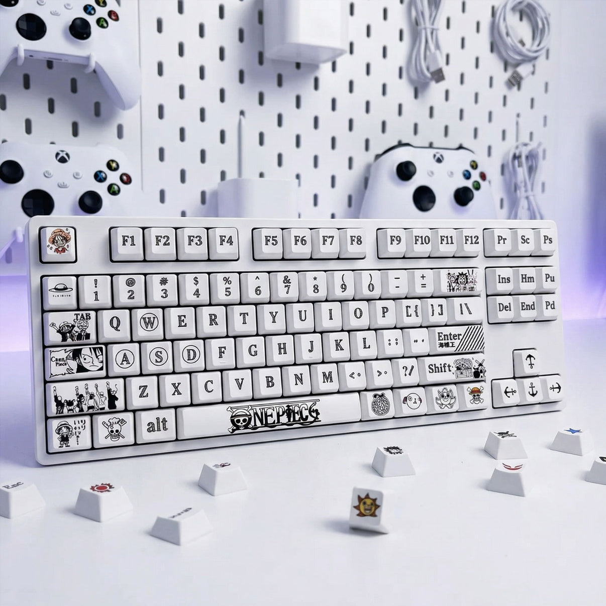 Each keycap features detailed artwork inspired by the world of One Piece, with crisp monochrome styling.